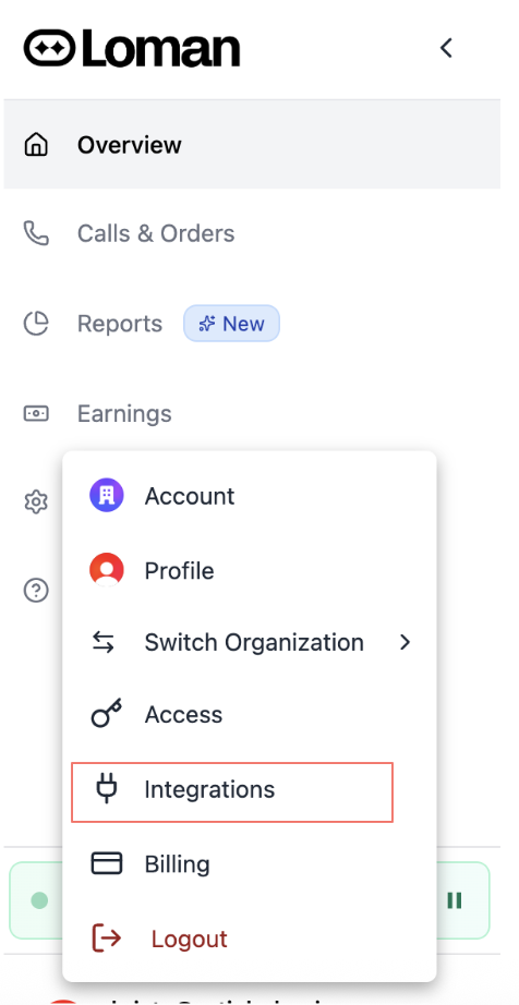 1. Click on your user in the lower left corner. Then Select Integrations.